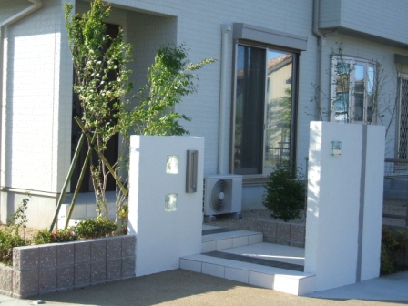 アプローチ階段や門袖にタイルでアクセントをつけました。